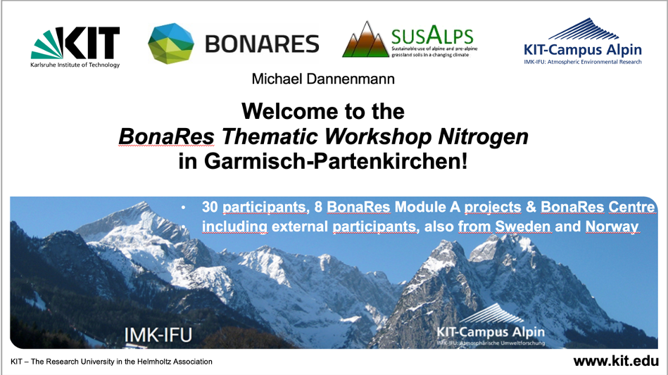 On 19 and 20 April 2023, 30 scientists from eight BonaRes Module A projects, the BonaRes Centre and external guests from Norway and Sweden, among others, met in Garmisch-Partenkirchen to discuss current understanding, knowledge gaps, and ways towards better mitigation of detrimental impacts of nitrogen cycling in agricultural ecosystems. Central topics were i) biotic and abiotic drivers of nitrogen turnover and nitrogen losses in agricultural soils, ii) nitrogen management, iii) modelling of nitrogen fluxes and turnover as well as iv) possibilities to transfer the new findings to practice.