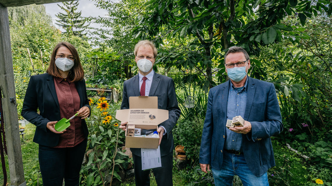 Matthias Graf von Kielmansegg, Head of Department at the Federal Ministry of Education and Research, gives the starting signal for the second phase of the citizen research campaign "Expedition Earth" in the Science Year 2020|21 -Bioeconomics. together with Prof. Dr Hans-Jörg Vogel and Luise Ohmann from the Helmholtz Centre for Environmental Research,